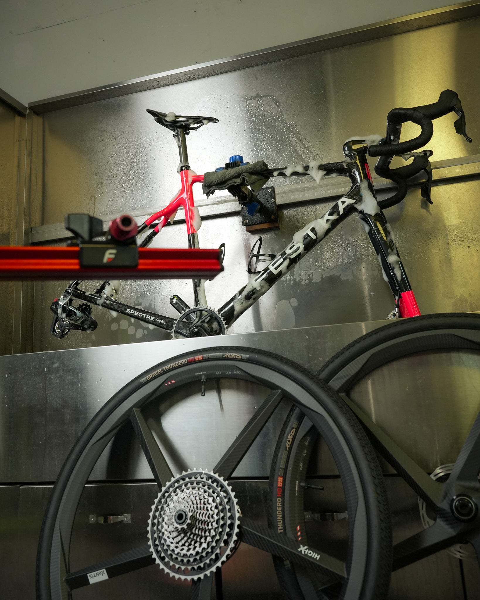 • 搭配溫和噴霧水流沖洗車架,去除污垢、汗鹽與灰塵