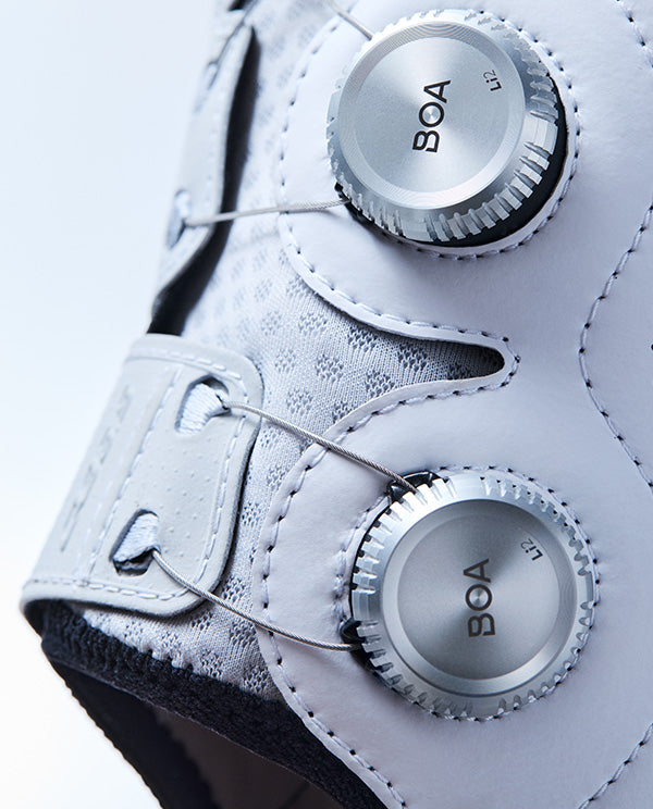 襪套式無鞋舌設計,不只消除了傳統鞋款的壓迫感,更讓柔軟的網狀表面緊貼腳背,兼顧透氣性與包覆度。雙 BOA Li2 精密旋鈕結合 Power Wrap 包覆結構,讓每一次踩踏都扎實有力,零延遲。
